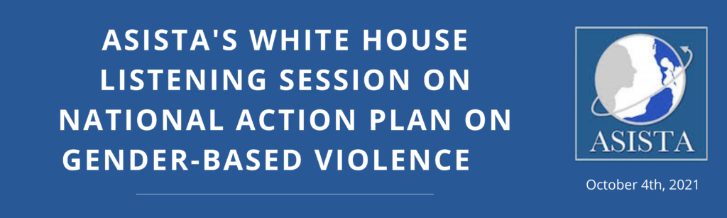 On October 4, 2021, ASISTA hosted a White House Listening Session to share insights and recommendations to the White House as they develop the U.S.’s first National Action Plan on Gender-Based Violence. Click here to access the session recording & here to access the presentation materials .